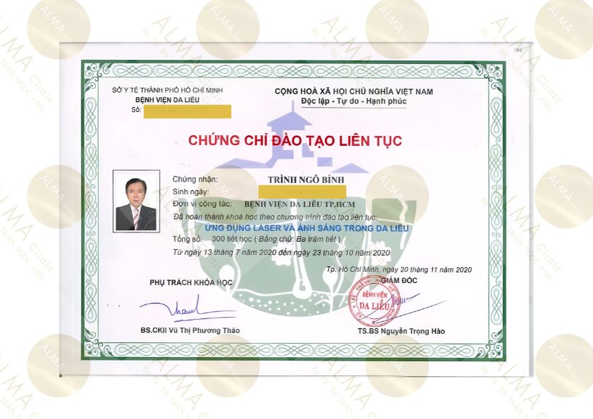 Được đào tạo bài bản tại Đại học Y Dược TP.HCM với nhiều chứng chỉ chuyên môn cao. ThS.BS. Trình Ngô Bỉnh sở hữu bằng Thạc sĩ Y học chuyên ngành Da liễu và Bác sĩ Nội trú xếp loại Giỏi từ Đại học Y Dược TP.HCM. Ngoài ra, Bác sĩ còn có Chứng chỉ hành nghề Khám bệnh, chữa bệnh chuyên khoa Da liễu do Sở Y tế TP.HCM cấp, đảm bảo đáp ứng đầy đủ các yêu cầu về chuyên môn và pháp lý trong hành nghề.